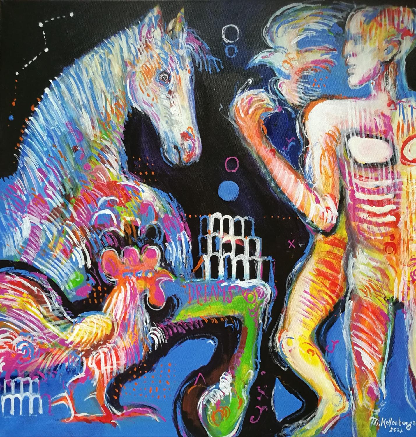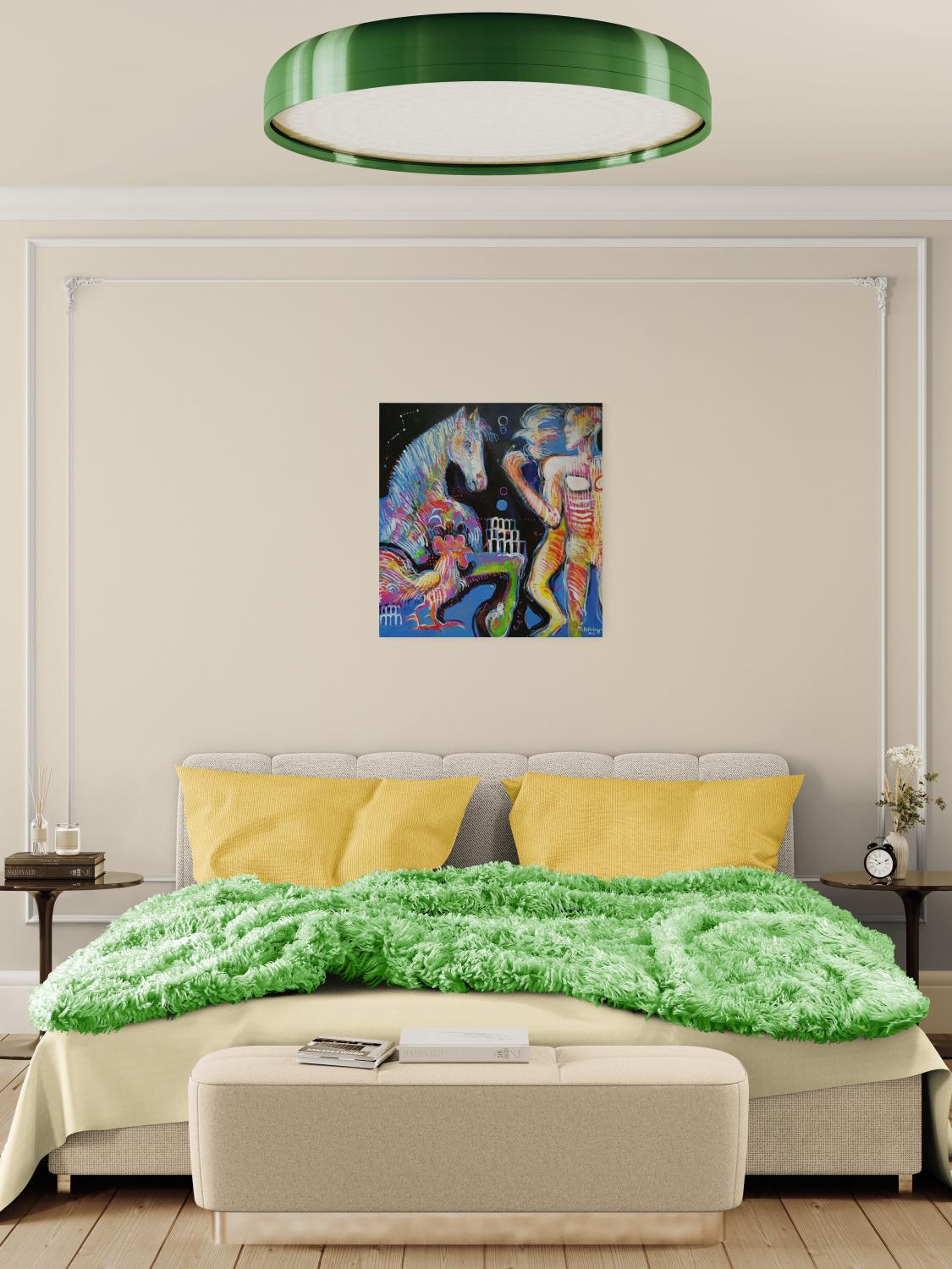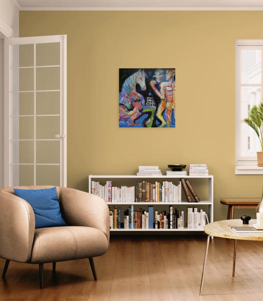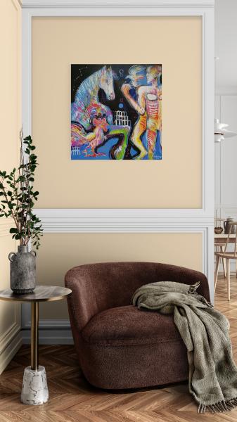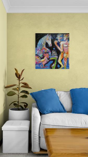 Na plátně se před vámi odvíjí mou fantazií viděný biblický příběh z Rajské zahrady, ve které Adam a Eva žili v dokonalé symbióze se zvířaty a přírodou.
