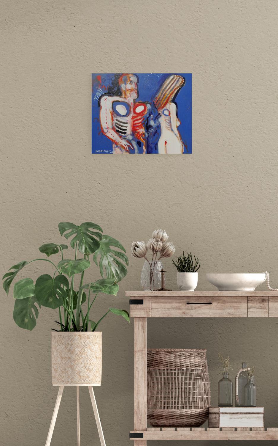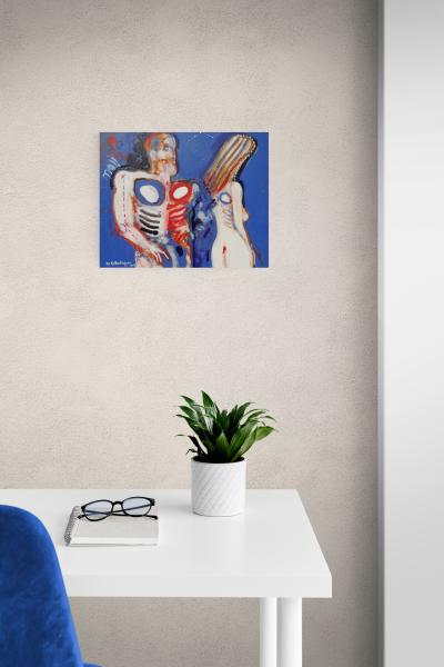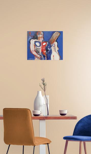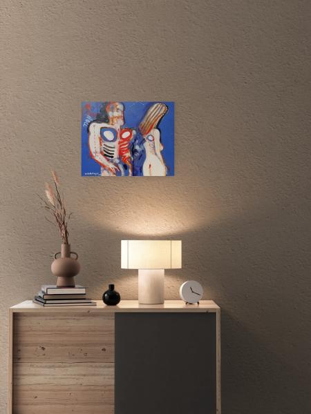 Emoce, ale i novou realitu jsem symbolicky namaloval modrou barvou pozadí, která nahradila barevné pozadí na těch mých malbách, které zobrazují pobyt Adama a Evy ještě v Rajské zahradě.