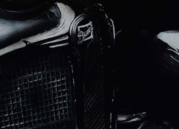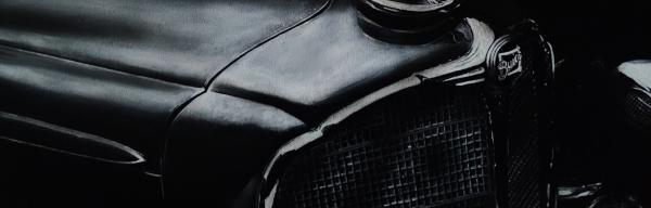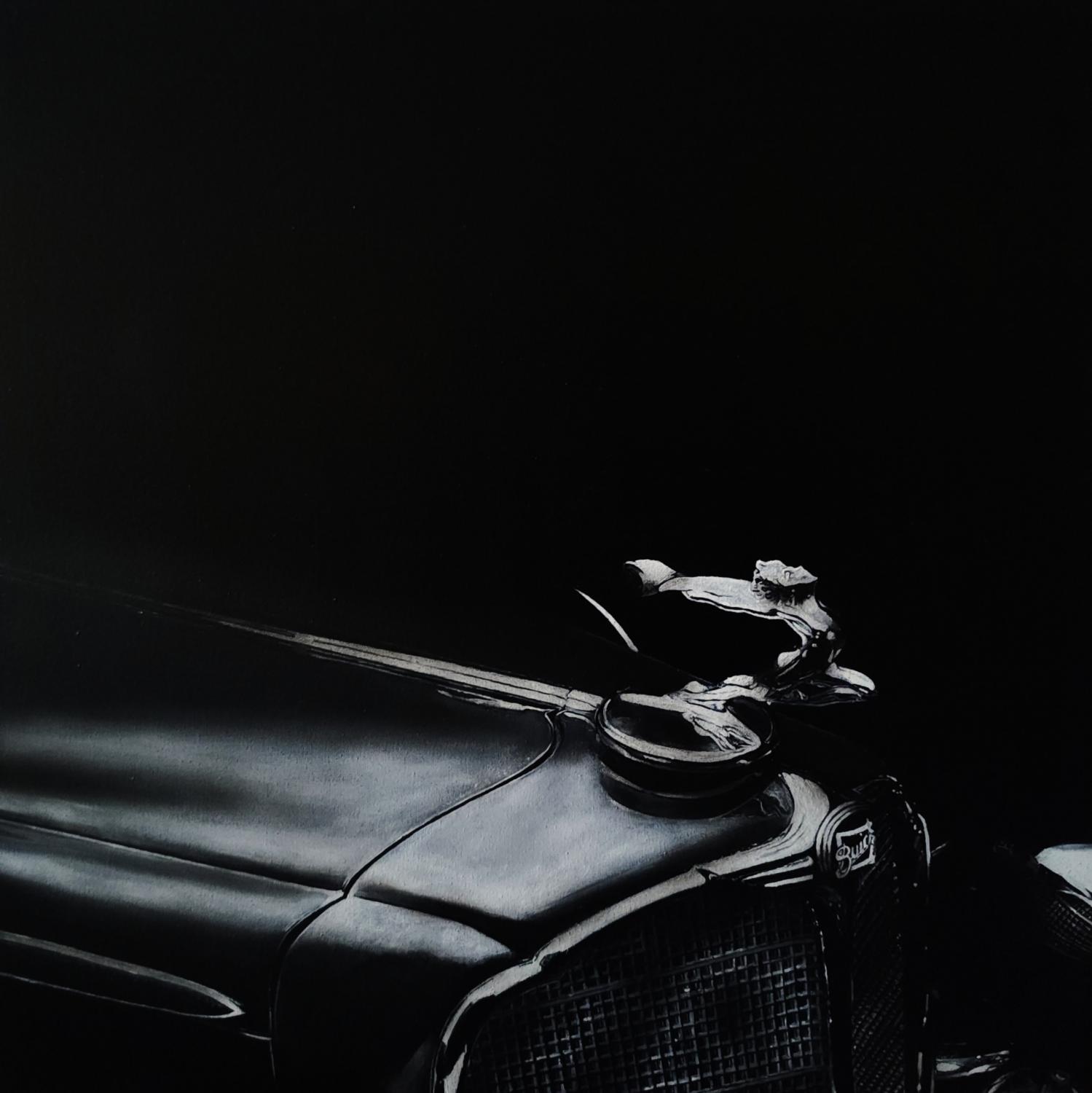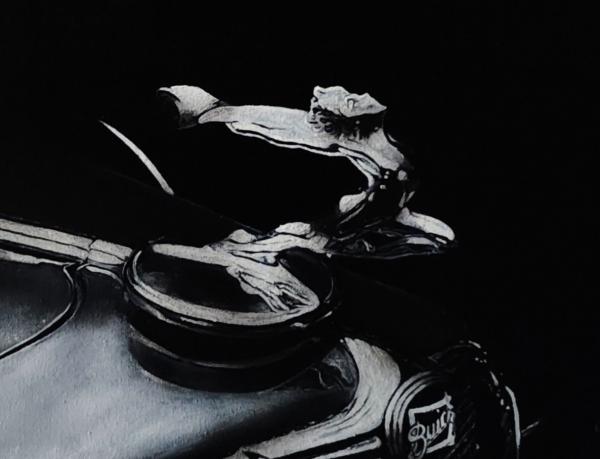 Tento obraz zobrazuje detailní a elegantní výjev přední části klasického automobilu. Jedná se o vintage model značky Buick, což naznačuje malý znak na masce chladiče. Dominantou obrazu je chromová soška na kapotě auta, která je typická pro stará luxusní vozidla, dynamický symbol rychlosti a elegance.Obraz má veľmi tmavé pozadie, čo vytvára silný kontrast s lesklým čiernym lakom karosérie a chrómovými detailmi.Světlo dopadá z levé strany a zvýrazňuje křivky karoserie, čímž dodává obrazu dramatičnost.Celkově působí obraz jako hyperrealistická malba,je vizuálně silný, stylový a nostalgický výjev automobilové historie.