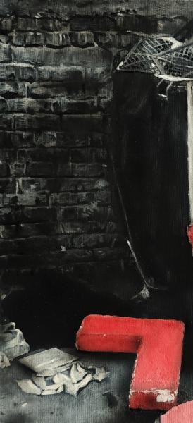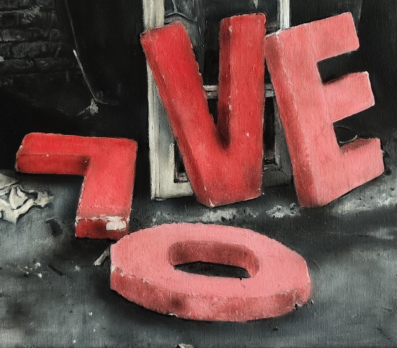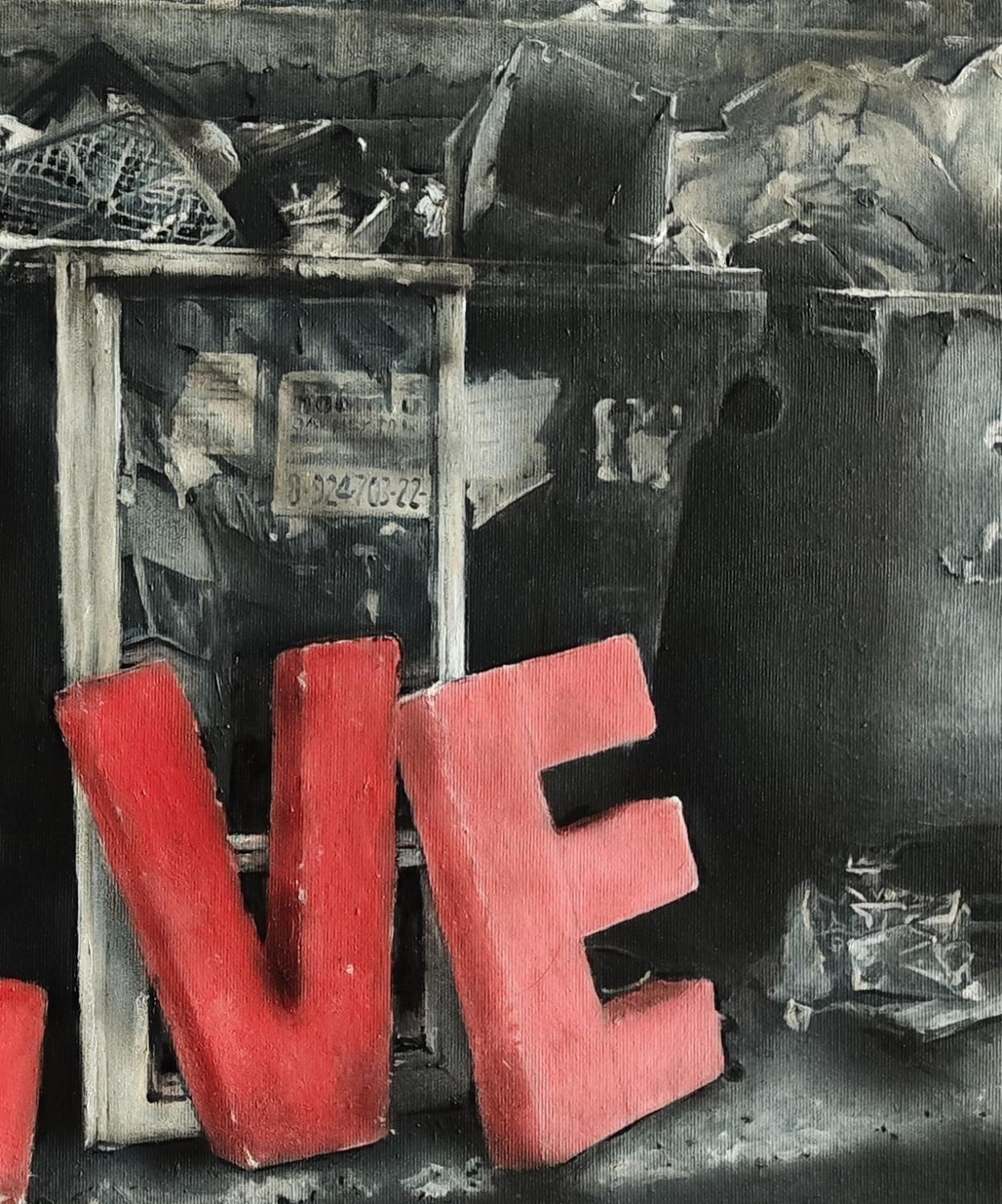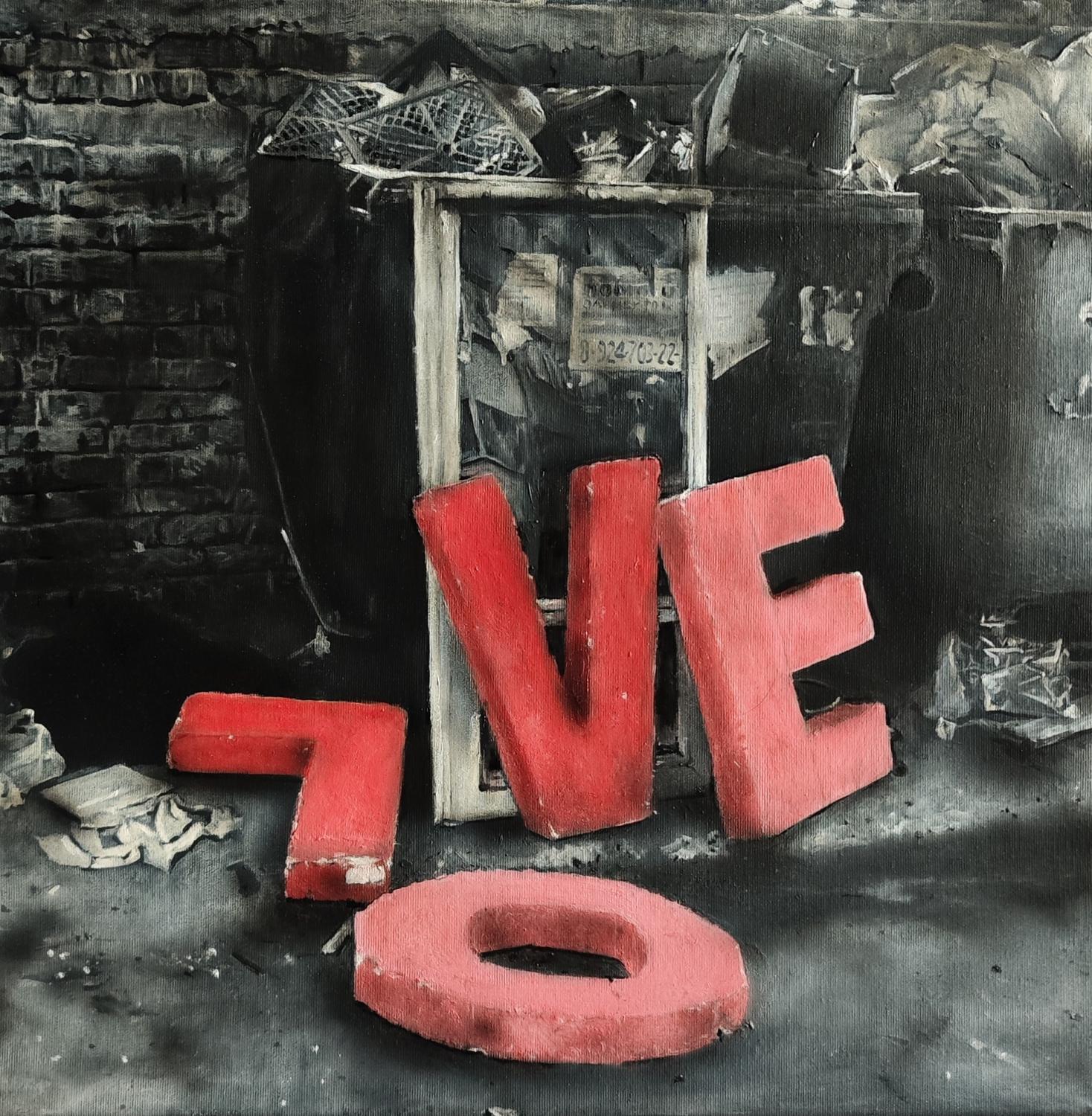 Tento obraz má sociální a symbolicky nabitou kompozici. Vidíme pohozená velká červená písmena, která kdysi tvořila nápis „LOVE“. Nyní však leží roztroušeno na špinavé zemi před odpadkovým kontejnerem.Písmeno L je převrácené,písmeno O leží na zemi odděleně,písmena V a E jsou opřena o konstrukci u kontejneru.Pozadí je temné a špinavé.Stará cihličková stěna, přeplněné popelnice, rozházené papíry a odpad.Celá scéna působí ponuře, v kontrastu s jasnou červenou barvou písmen.Obraz kritizujr dobu ve které se láska a základní lidské hodnoty staly „odpadem“, který společnost odhazuje.Slovo už není čitelné, jeho integrita se rozpadla, což symbolizuje zničení vztahů, prázdnotu za běžnými frázemi. Jasně červená písmena uprostřed šedivého, špinavého prostředí jsou jako poslední záblesk vášně a naděje.Celkovo obraz působí velmi kriticky, melancholicky a zároveň provokativně. Nutí diváka zamyslet se nad tím, co společnost považuje za hodnotné a co končí mezi odpadky.