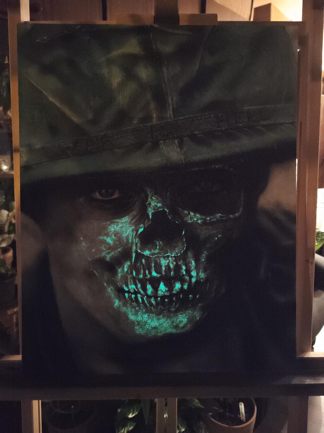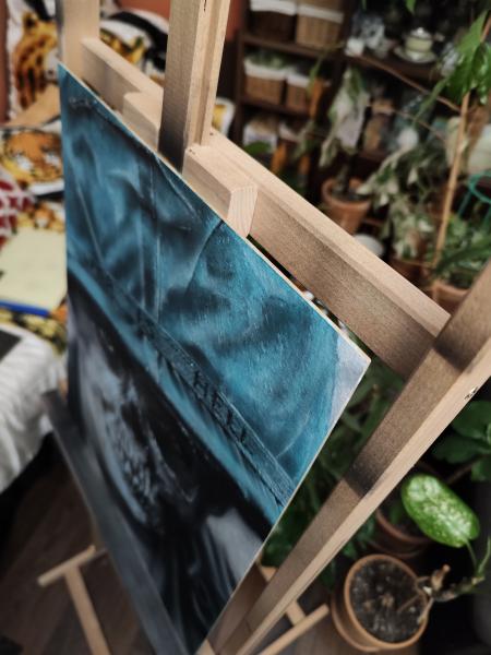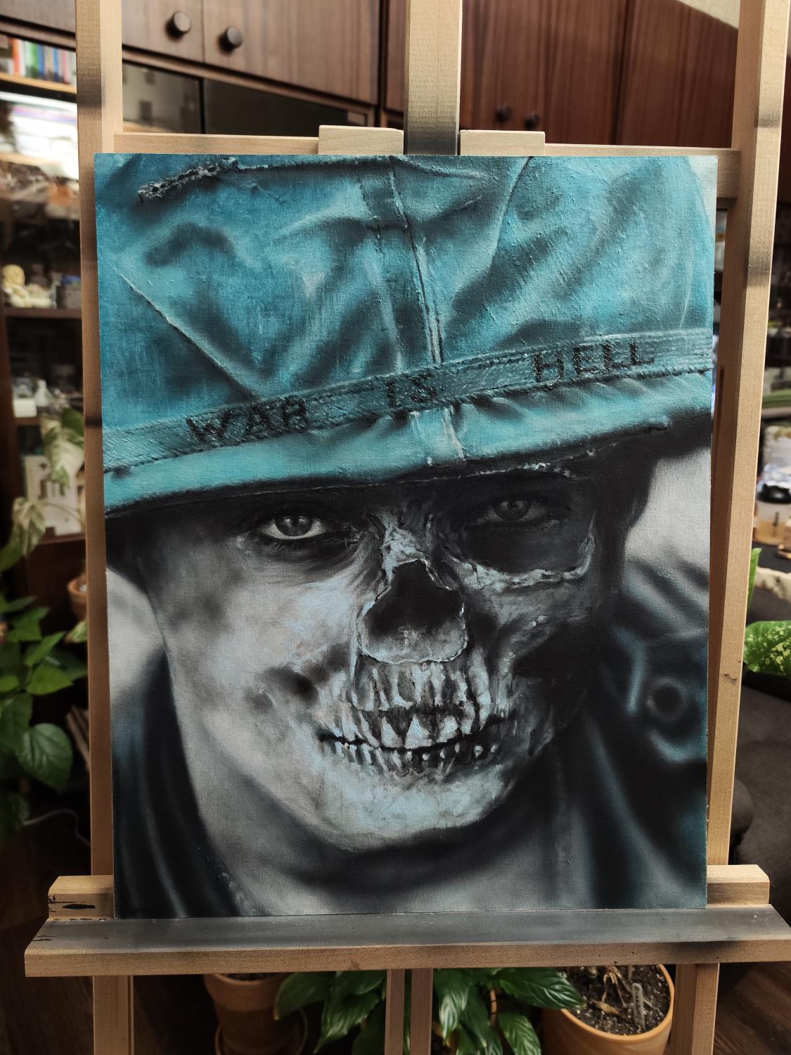 Tento obraz působí velmi temně.Je na něm zobrazena tvář člověka,(vojáka).Helma má tyrkysově-modrý odstín a je na ní nápis „WAR IS HELL“ (válka je peklo),hlavní poselství díla.Nejvýraznějším prvkem je samotná tvář.Polovina je realistická,druhá část pozvolna odhaluje přeměněnou na lebku.Tato proměna není ostrá,postupně se rozpadá,mizí.Oči zůstávají pevně upřeny na diváka,čímž vzniká intenzivní a mírně znepokojivý vizuální kontakt.Barevnost je utlumena,převážně studené tóny,které podporují pochmurnou atmosféru.